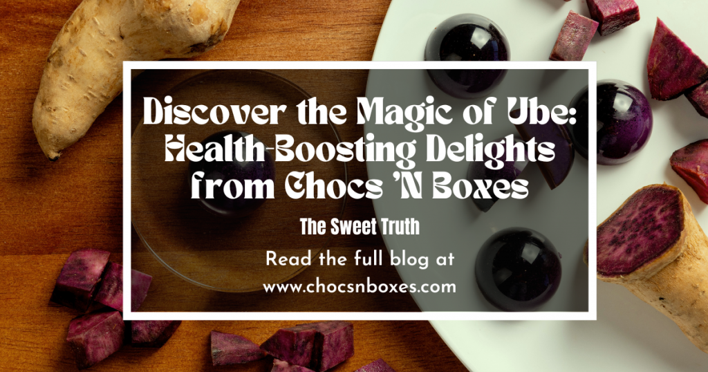 Exploring the health benefits of ube and introducing Chocs ‘N Boxes Ube Products can provide valuable information and an enticing experience for our customers. Ube, a vibrant purple yam from the Philippines, has increasingly attracted attention due to its unique flavour and impressive health properties. At Chocs ‘N Boxes, we are excited to present our range of ube-infused delights that seamlessly merge health benefits with gourmet chocolate artistry.