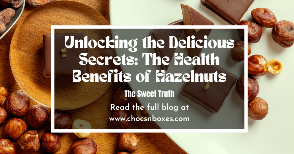 At Chocs ‘N Boxes, we are delighted to share the goodness of hazelnuts, a delectable nut that not only enhances the taste of our premium chocolate products but also offers a treasure trove of health benefits. Hazelnuts, known for their distinct flavor and crunch, are a perfect ingredient for creating indulgent and nutritious treats.